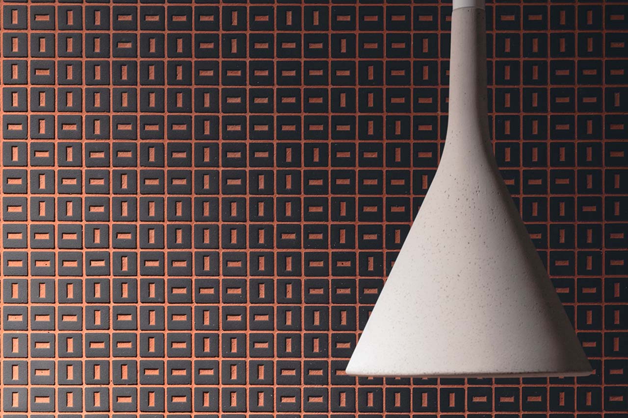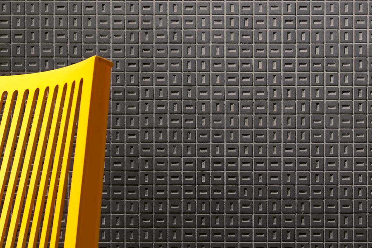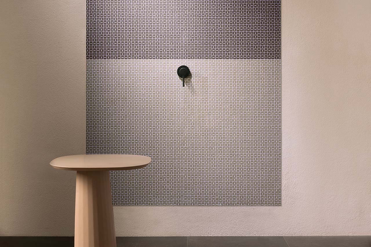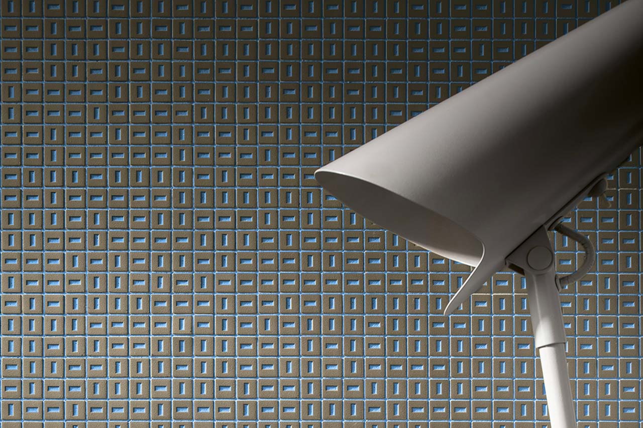Designer Simone Bonanni säger så här om sin mosaik “I was interested in the movement, in the vibration. I focused exclusively on the design of the single chip, aware that a graphic sign on repeated element - especially if simple or almost imperceptible - would generate a continuous pulsation all over the composition. It is a way to make the wall vibrant and present, to think beyond the traditional grid structure.”