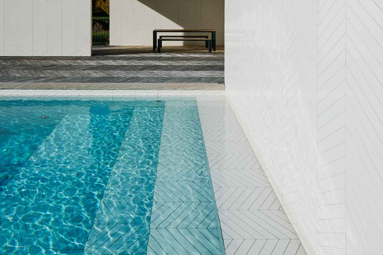 En pool och ett poolhus i en privat fastighet i södra Sverige. Poolklinker: White Less, specialsågad för detta projekt för att kunna lägga fiskbensläggning i både pool och på fasad till poolhus.