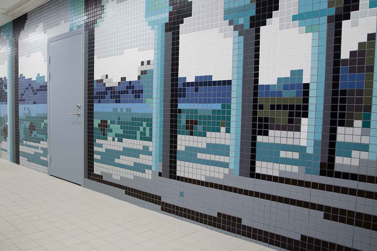 Utsmyckning i Gyllene Salens kök i Stockholms Stadshus. Motivet är gjort av 5x5 cm mosaik och är tänkt att återspegla Stadshusets historia med motiv över pelargången och Norr Mälarstrand.